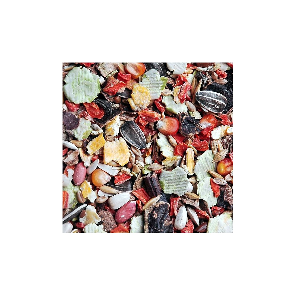 Slunečnice bílá, slunečnice černá, kukuřice, ječmen, oves, čirok, pšenice, slunečnice žíhaná velkozrnná, podzemnice, mrkev, extrudovaná rýže, extrudované obilniny, mrkvové vločky, rýžové vločky, hrachové vločky, ovesné vločky, kukuřičné vločky, svatojánský chléb.