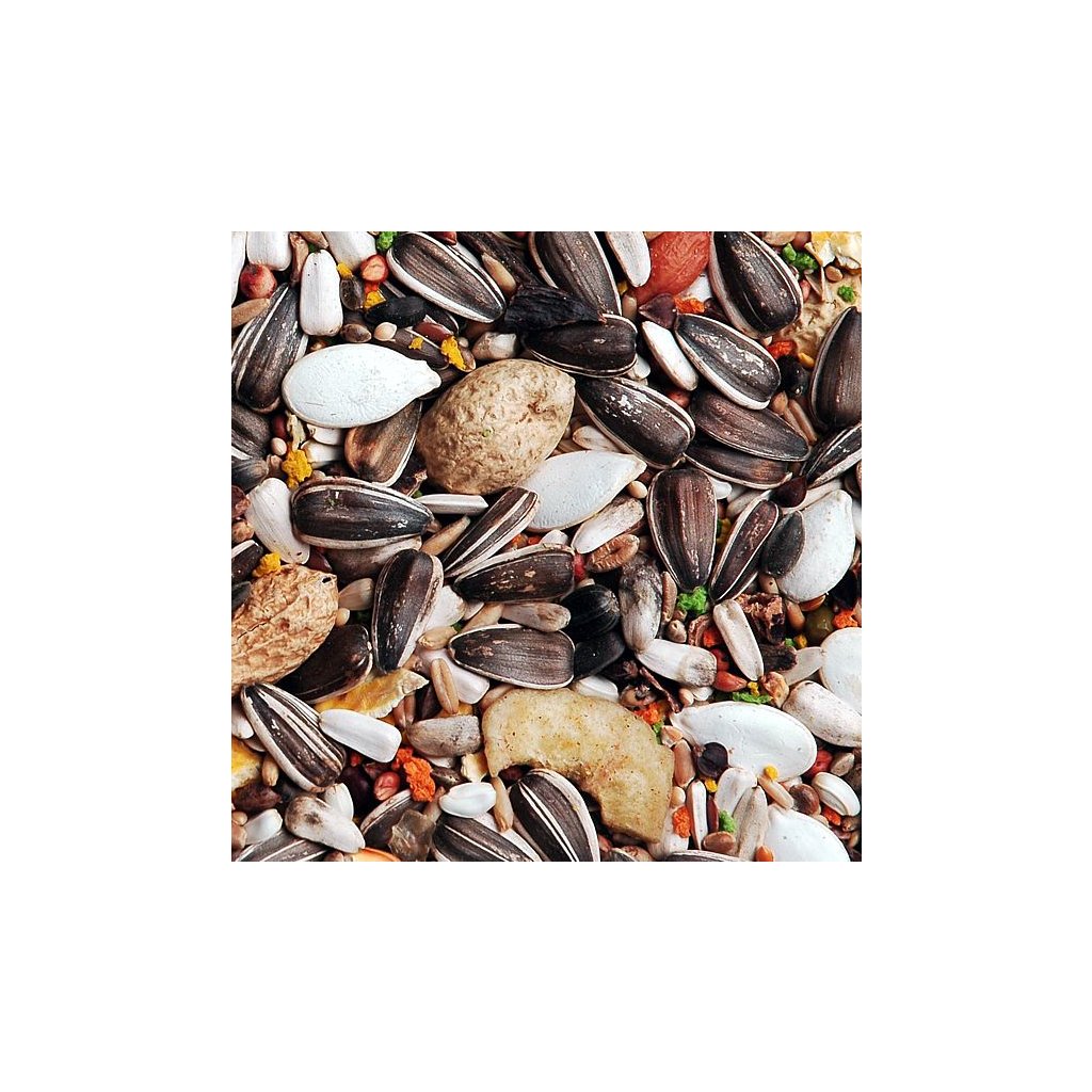Složení: vločky z mrkví, lněné semínko, kukuřičné vločky, jáhly červené, kukuřice, extrudované obiloviny, podzemnice olejná ve skořápce, jádra podzemnice olejné, karob, pohanka, oves nahý, slunečnice černá, banánové lupínky, slunečnice pruhovaná velké zrno.