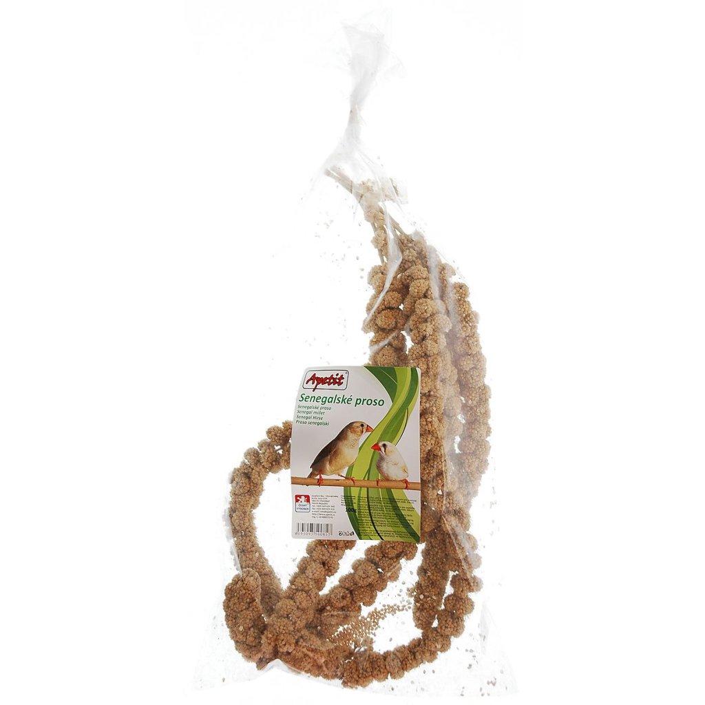 Senegalské proso v přírodní podobě v klasech. Zábava a doplňkové krmivo. Slouží k ozobu pro drobné exotické ptactvo, malé papoušky a andulky. Velice oblíbená pochoutka. Papouškům chutná nejvíce v klasech.