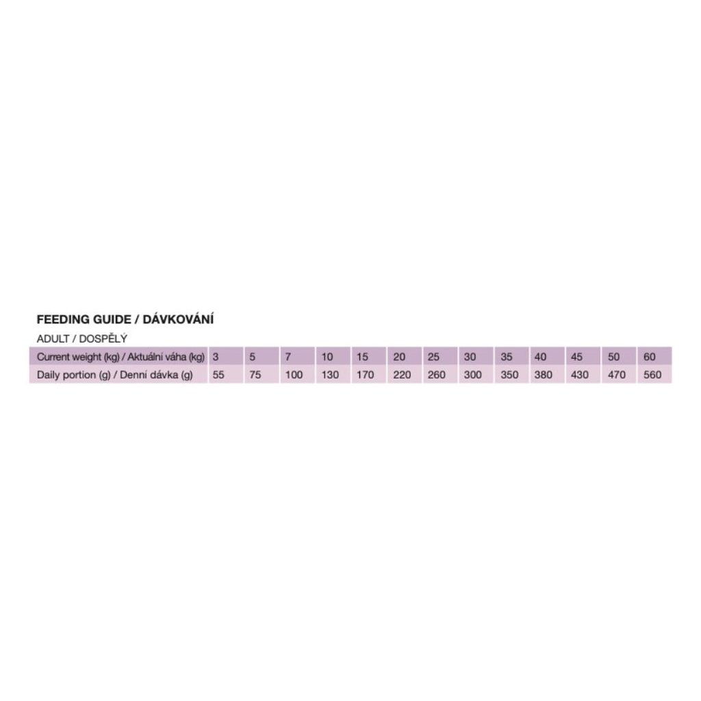 NÁVOD K POUŽITÍ: Jídlo podávejte suché, nebo zalité vodou. Po úvodním období krmte svého psa denními dávkami podle hmotnosti psa na tabulce. Doporučená denní porce je pouze orientační. Množství denního krmiva závisí na kondici a věku psa. Pokud má pes nadváhu, snižte denní porce o 10 %. Pokud má pes podváhu, zvyšte denní dávku o 10%. Vždy by měla být k dispozici čistá, čerstvá voda. Skladujte na suchém místě.