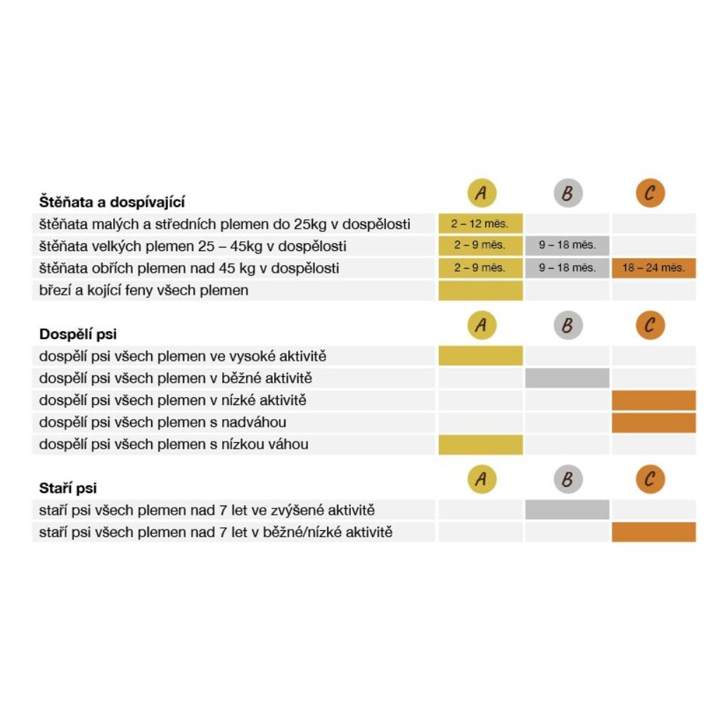 Receptura B je středně silná receptura v řadě BOHEMIA. B receptura obsahuje střední hladiny bílkovin, tuků a energetické hodnoty. Proto je vhodná pro štěňata velkých plemen viz. tabulka dávkování. Dospělé psy v běžné aktivitě a starší psy v aktivitě zvýšené.