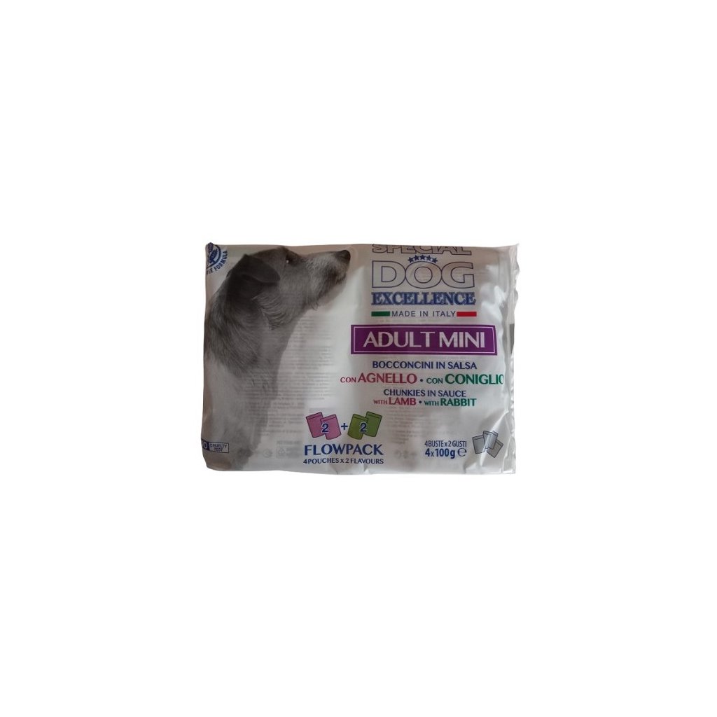 Lahodná receptura vyrobená v Itálii, bez barviv, konzervačních látek a přidaných cukrů. Special Dog Excellence je produktová řada navržená tak, aby vašemu psovi nabídla jen to nejlepší. Kompletní a vyvážená strava, speciálně sestavená tak, aby podporovala každodenní pohodu vašeho nohatého přítele a splňovala jeho nutriční potřeby. Výhodné multibalení obsahující 4 kapsičky po 100 gramech s chutnými kousky v omáčce pro dospělé psy malých plemen ve dvou různých příchutích: