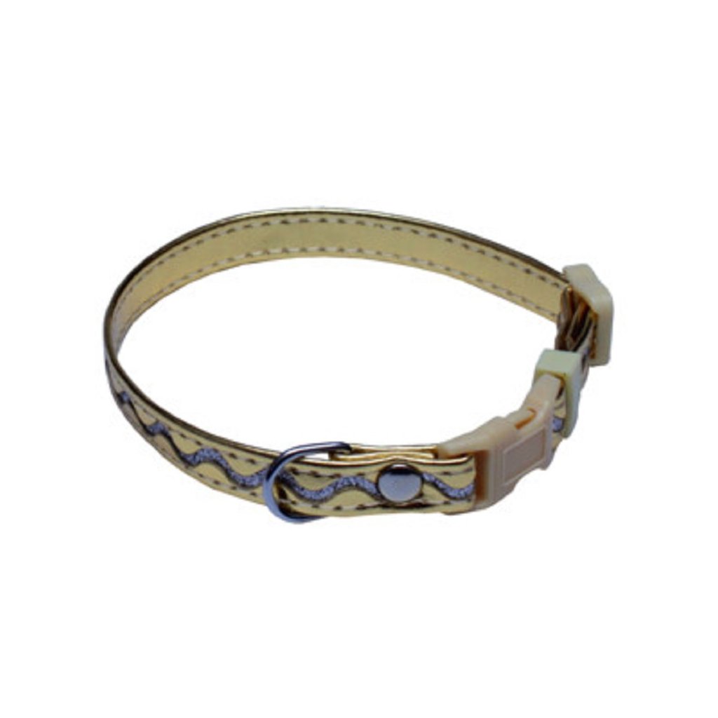 Obojek je vyroben z velmi příjemné a měkké koženky zdobené vlnkou se stříbrným třpytem. Součástí je plastová přezka, která umožňuje obojek upravovat dle obvodu krku. Je zde i svařované déčko pro připnutí vodítka. Obojek je vhodný pro malá plemena. Rozměr: 1,2 x 18-28cmBarva: zlatáDoplňkové parametry