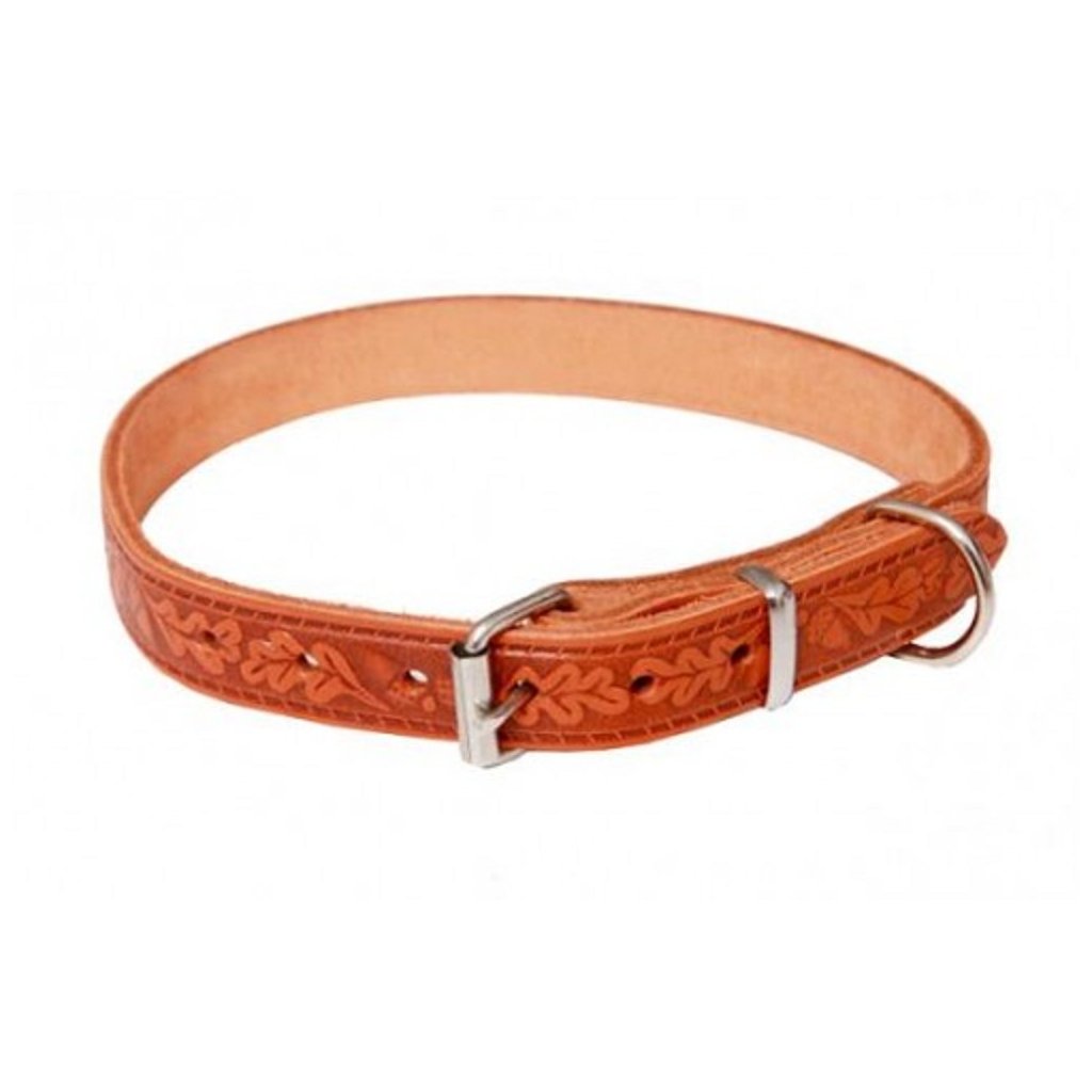Obojek je vyroben z příjemné hovězí kůže, ozdobu zajistí vlis dubového listu a žaludu. Zapínání je na klasickou přezku a dirky. Obojek je vybaven svařovaným déčkem pro připnutí vodítka. Rozměr: šířka 1,8cm, délka 50cmBarva: koňak