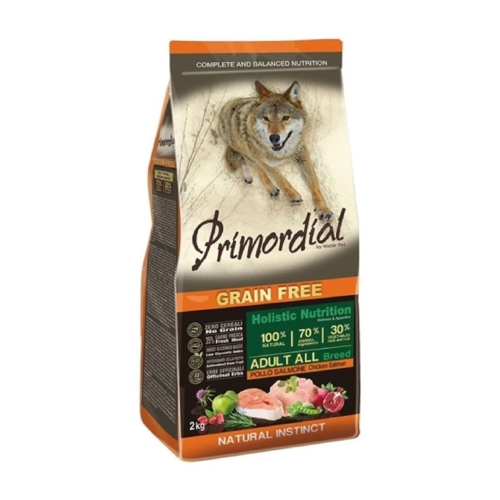Primordial kuře s lososem je kompletní, bezobilné a vysoce stravitelné krmivo pro dospělé psy. Kuřecí maso poskytuje snadno stravitelné bílkoviny. Losos je bohatým zdrojem Omega-3 mastných kyselin, které vykonávají důležitou kosmetickou funkci pro kůži a srst a jsou velmi prospěšné pro kardiovaskulární systém (srdce a cévy). Ovoce a zelenina jsou bohaté na vitaminy a minerály. Jedná se o skutečně holistický produkt, který aktivně přispívá k celkovému zdraví psa.Složení: Čerstvý losos 35 %, sušené kuřecí maso 24 %, hrášek, brambory, kuřecí tuk 11 %, bob obecný, lněné semínko 2 %, sušená dřeň z červené řepy, pivovarské kvasnice, mleté mořské řasy 0,3 %, fruktooligosacharidy 0,2 %, výtažky z kvasnic 0,2 %, juka 0,03 %, ostropestřec mariánský (Silybum marianum L.) 0,02 %, sušené granátové jablko (Punica granatum) 0,02 %, sušené jablko (Malus pumila) 0,02 %, sušený plod šípku (Rosa Canina L.R., Pendulina L.) 0,002 %, glukosamin, síran chondroitinu, výtažek z rozmarýnu.